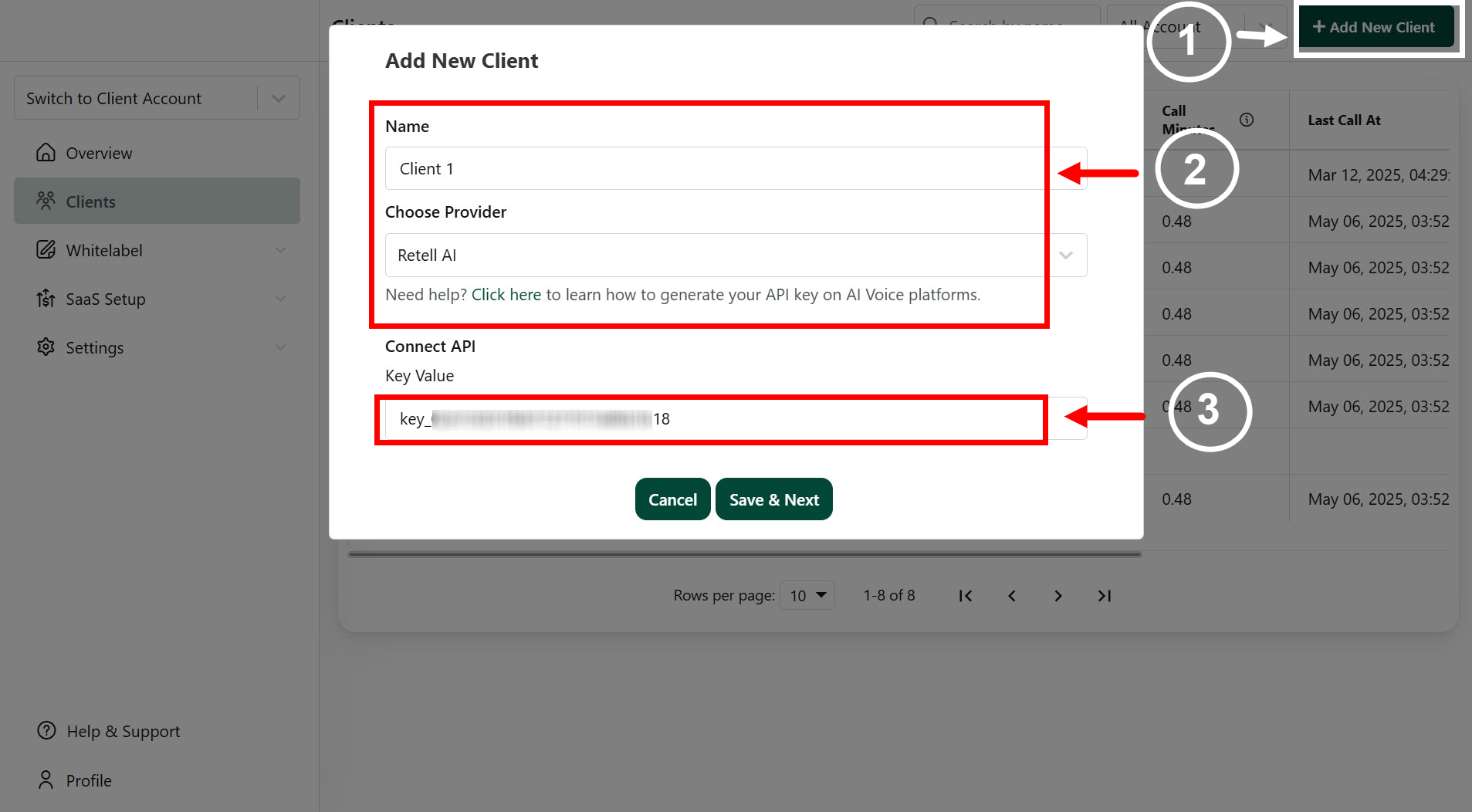 Step 2: Enter a Name for the New Client and select a Voice Provider (e.g., VAPI or RETELL).